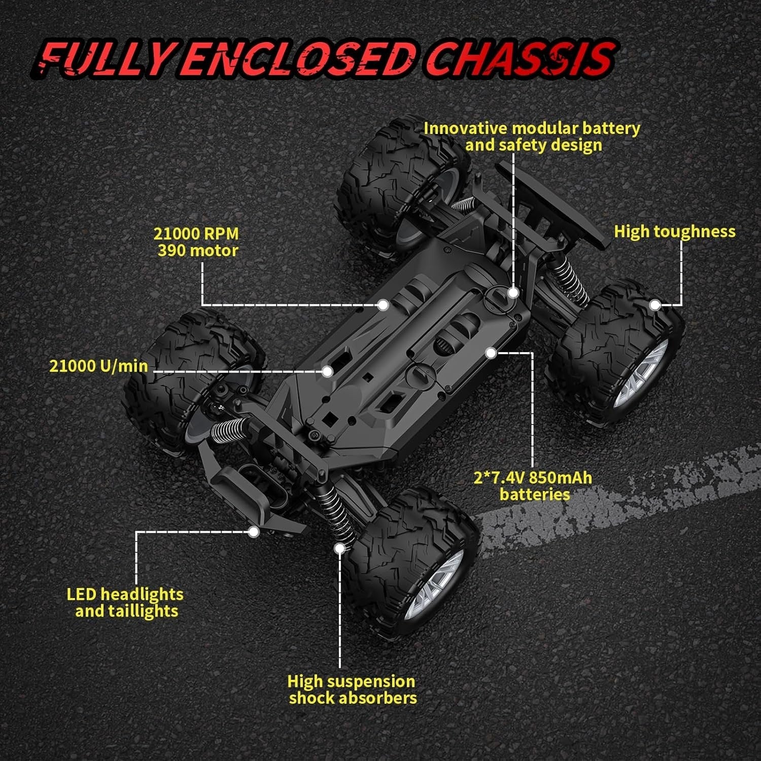 1:18 Scale High Speed RC Car: This 4WD high-speed remote control car with its 380 high-speed motor can reach speeds of 25 mph. The car’s 4-wheel drive, powerful motor and high traction tires can handle any surface and grade. The remote control comes with a speed level setting knob you can adjust for different types of runs.- Long Battery Life, All Terrain: This rc truck comes with two 7.4V 850mAh high quality rechargeable batteries which can provide about 40 or more mins of fun filled driving time. The rc cars for adults and kids can climb all types of terrain: grass, gravel road, beach, hills and whatever you can find to put it up against. It can not only handle small jumps with ease, but can also do wheelies and with the right terrain can even do flips.